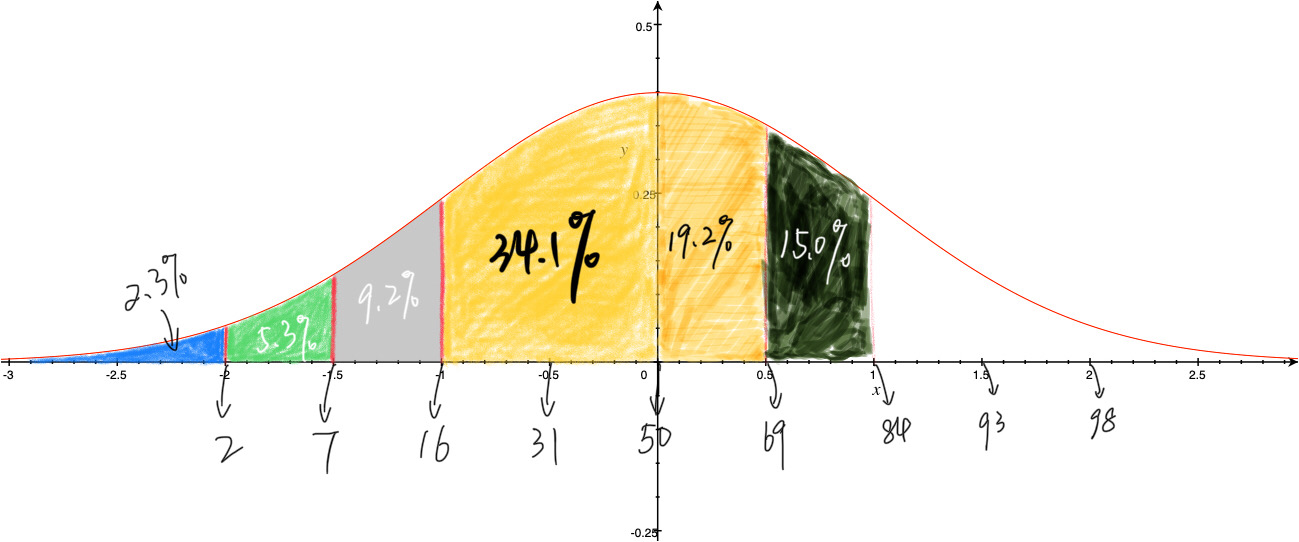 其他数据类型的理解 一般来说,测验报告采用数据呈现的形式有九分制、十分制、百分制、百分位数等,这些数据都是基于上图所示的正态分布图而来的,他们在内涵上是等价的,是数据的线性转换,使用何种呈现形式取决于报告编制者的偏好。 |